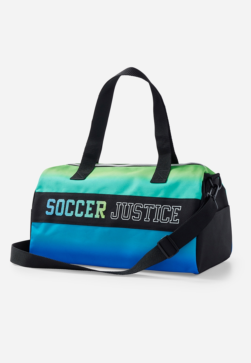 Item # 7710408 Soccer duffel bag for light gear sports a bright ombre fade and glitter letters , Carry with sturdy and adjustable shoulder straps or handles , Silver top zipper closure , Sturdy exterior texture with side pockets