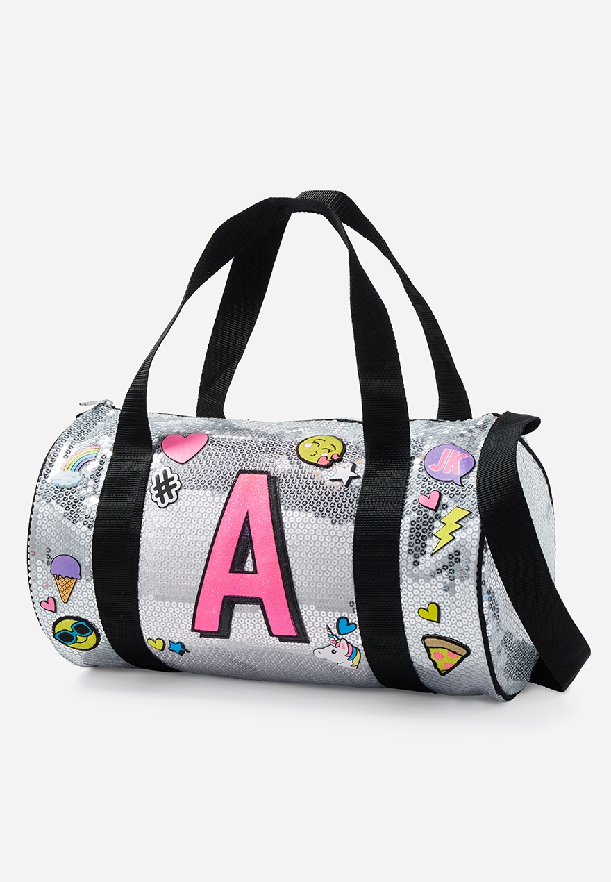 Item # 7710335 Allover shimmering silver sequin duffel bag with colorful emoji patches and graphics, Pink glitter initial on front, Carry with adjustable shoulder strap or use handles, Top zipper closure , 16 x 9.25 x 9.25