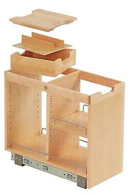 Includes: Base cabinet pullout with slide , vertical divider, adjustable shelf, hardware, instructions, wood half size organization tray accessory, wood half size cutlery tray insert accessory a Solid Birch wood construction with easy to clean glossy finish Color: Wood