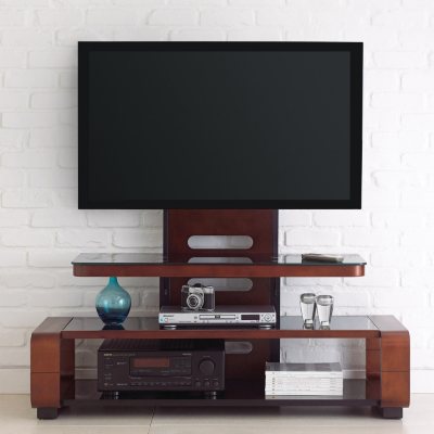 The Kenzo TV console draws you in with its warm cherry finish and smoked glass top and bottom shelf