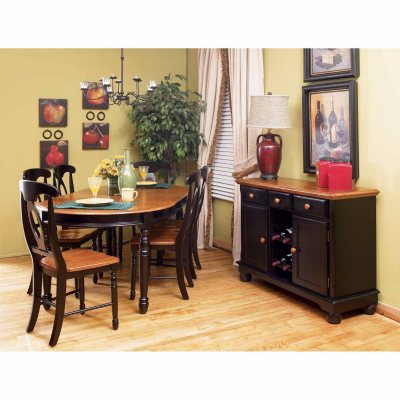 Highlighted by its beautiful two-tone finish, the 76" oval table features two 12" take-away leaves and can easily accommodate up to 6 guests
