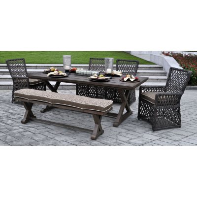 The dining table and bench are constructed of stout extruded and cast aluminum with a durable powder coating with a multi-step hand applied natural Weathered Teak finish