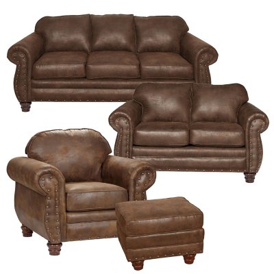 The Buckskin set features a beautiful leather-look microfiber fabric with rustic antique brass nailhead accents