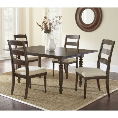 The dining set features ladder back chairs with upholstered seats and beautifully turned legs