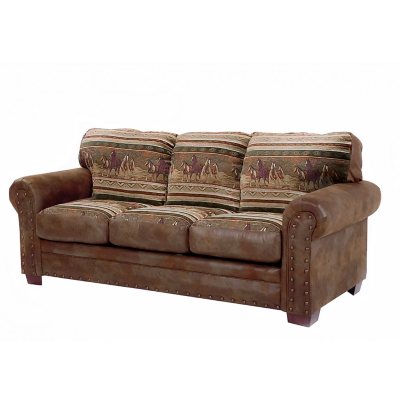 The upholstery is a mix of solid microfiber that looks like leather and printed-cotton tapestry featuring a wild horses motif