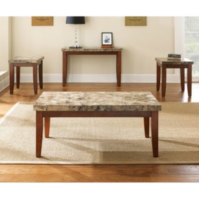 The set includes one cocktail table, two end tables and one sofa table.
