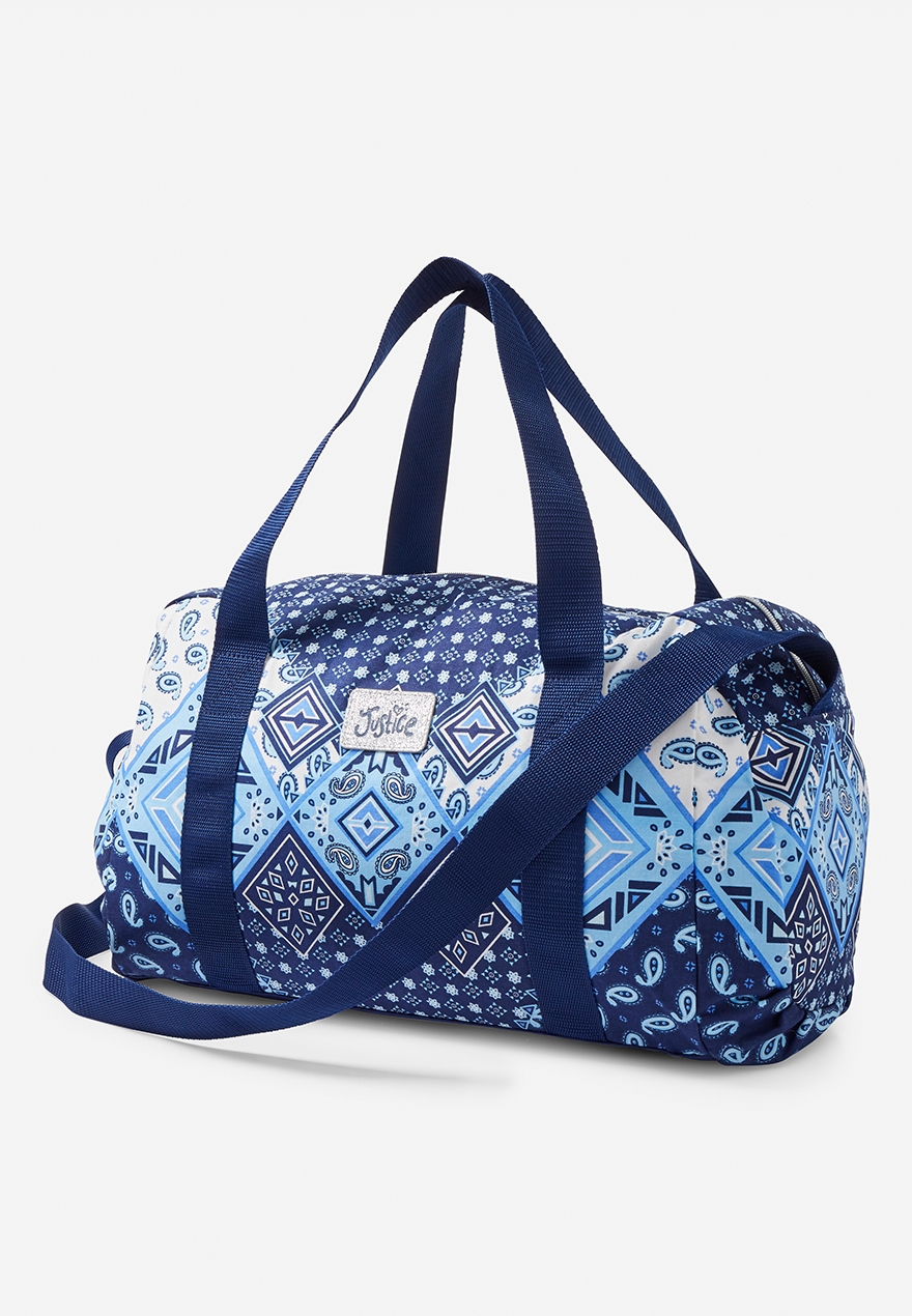 Item # 7710244 Graphic text print duffle bag with Justice logo on front, Carry with two-tone adjustable shoulder strap or detach and use handles, Top zipper closure and pocket on on side of bag, 16 x 6 x 11