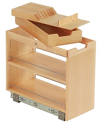Includes: Base cabinet pullout with slide, adjustable shelf, hardware, instructions, wood full size organization tray accessory and wood full size knife block accessory Solid Birch wood construction with easy to clean glossy finish Installs in minutes inside base cabinet leaving the above drawer intact