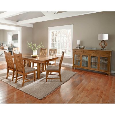 Crafted from solid American Red Oak and finished in a 12-step Rustic Oak finish, this Mission-style dining collection incorporates traditional design details with modern conveniences