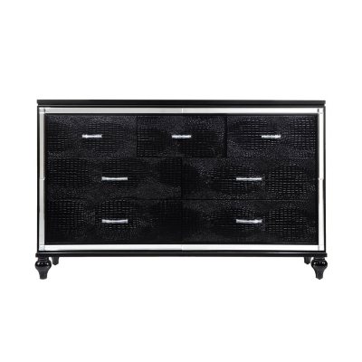 A sleek black finish, complemented by faux alligator-embossed drawer fronts will turn any space from drab to fab