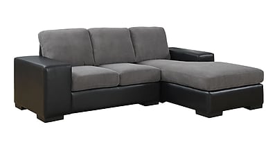 Upholstered in a soft, rich, grey corduroy and contrasting black leather look material this sectional is perfect for today's modern condos or smaller living spaces